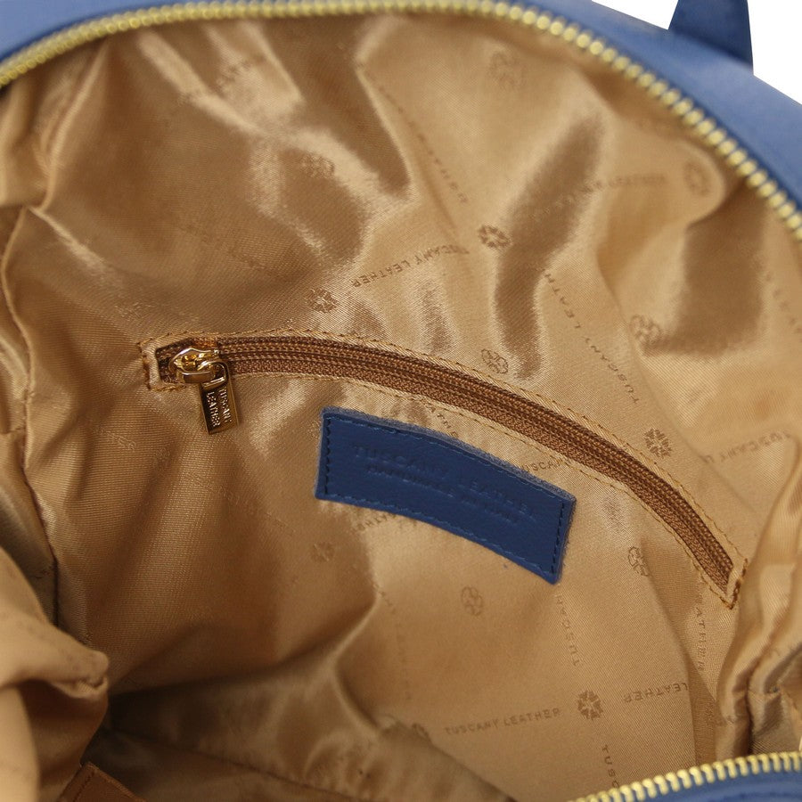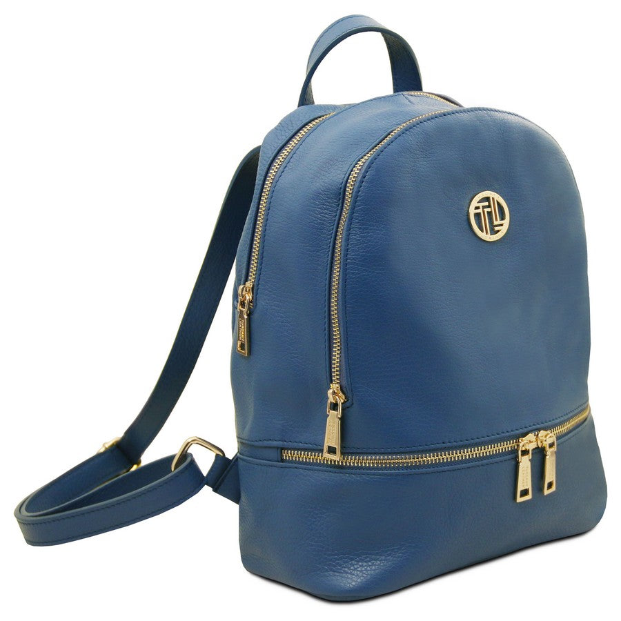 This luxurious Ladies Small Leather Backpack is crafted with soft, hammered leather and elegantly detailed with golden hardware that adds a touch of sophistication. It has a roomy compartment and various pockets to keep your items organized, plus a pocket with closure on the rear side for extra security. The interior features a zip pocket and an open pocket.