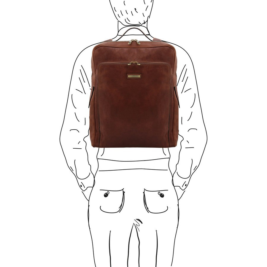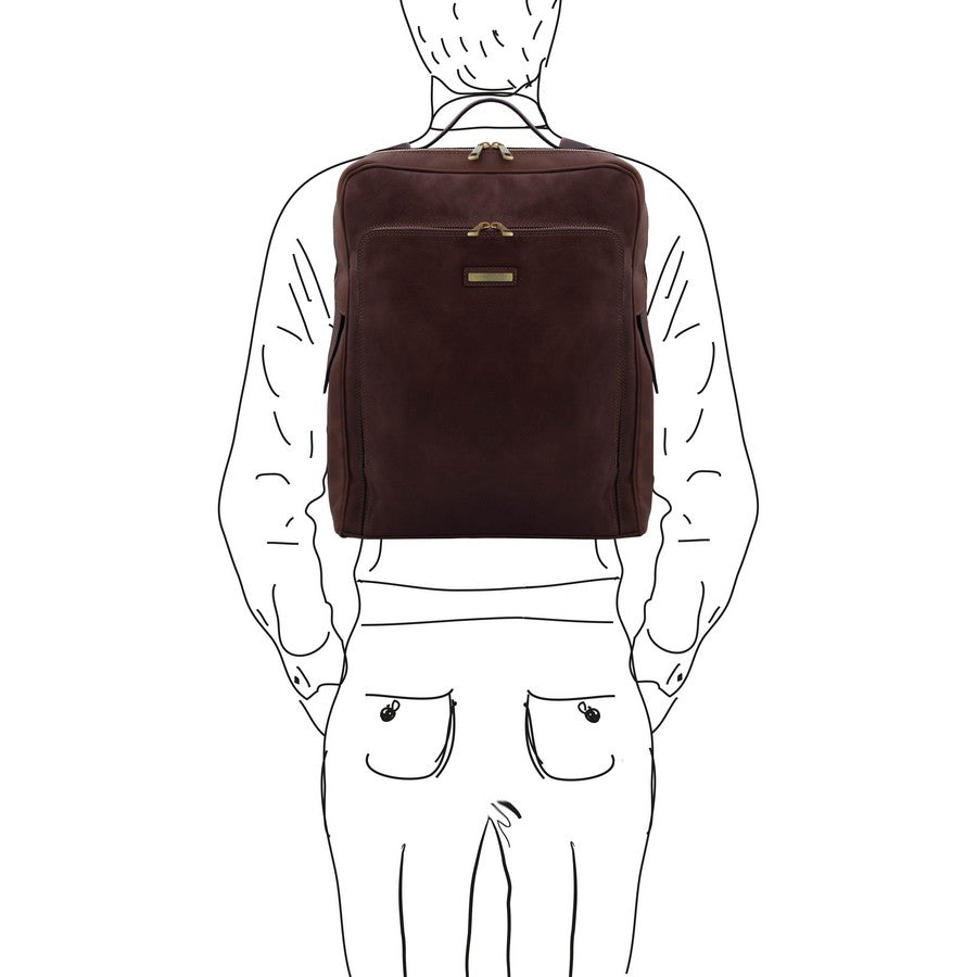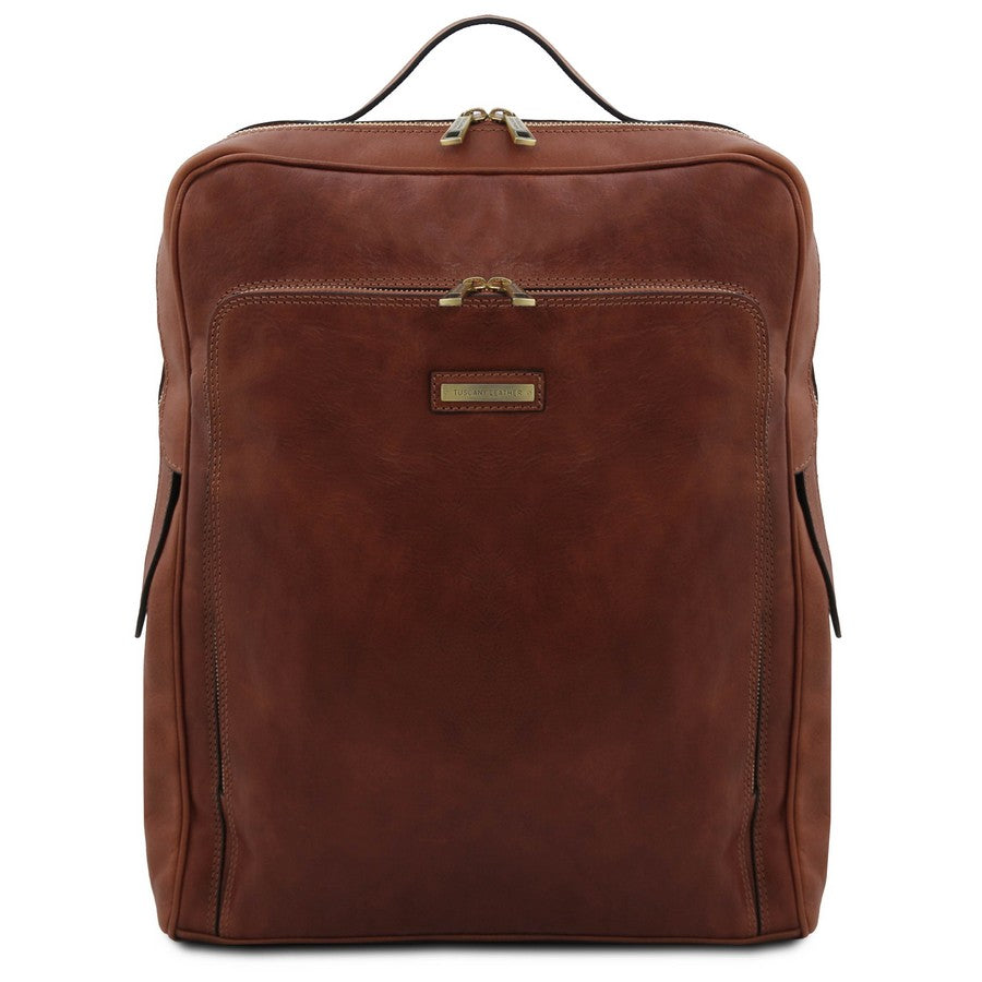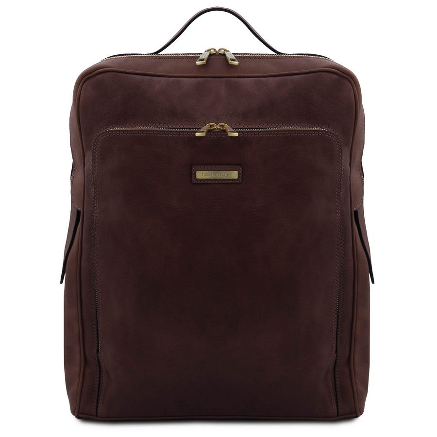 This Stylish Laptop Backpack is designed for daily use. Crafted from matte full grain hand stained vegetable tanned leather and a cotton lining, it features a semi-rigid structure with various pockets, compartments, and an internal laptop pocket. It can comfortably fit a 17" Laptop and A4 format, and can be attached to a trolley suitcase. It is finished with antique brass hardware and a secure zip closure on three sides.