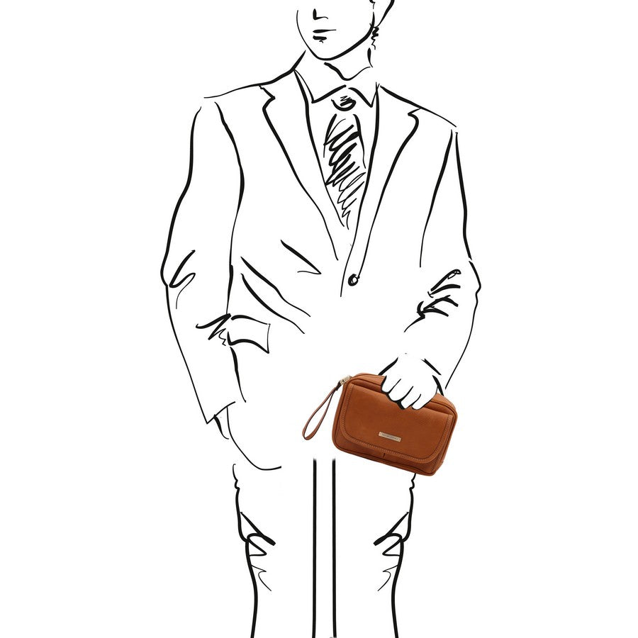 This Mens wrist bag combines style and functionality and crafted from full grain leather. Featuring one internal zip compartment, two additional external compartments and a rear zip pocket, this mens wrist bag will become an essential item that no discerning man should be without.