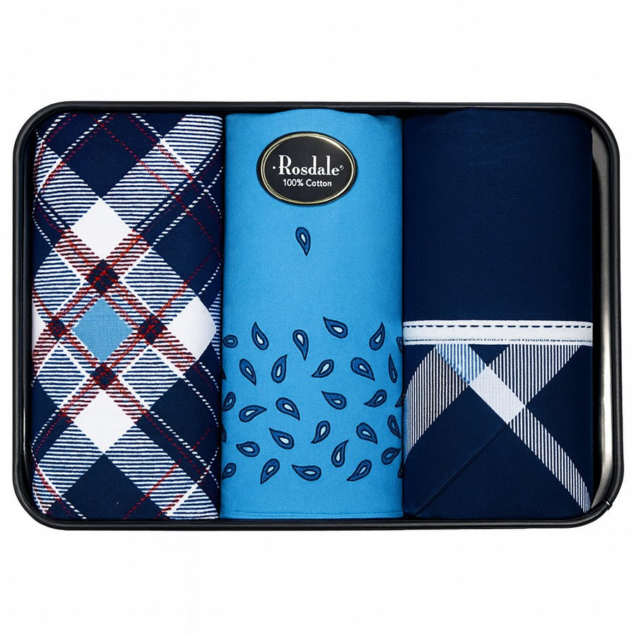 A trio of refined printed handkerchiefs designed for the modern gentleman who appreciates quality and style. Each piece combines practical everyday use with understated sophistication, making them an essential wardrobe staple. Housed in an elegant presentation tin, this collection makes a memorable gift for someone with refined taste. Perfect for adding a touch of distinction to any occasion.