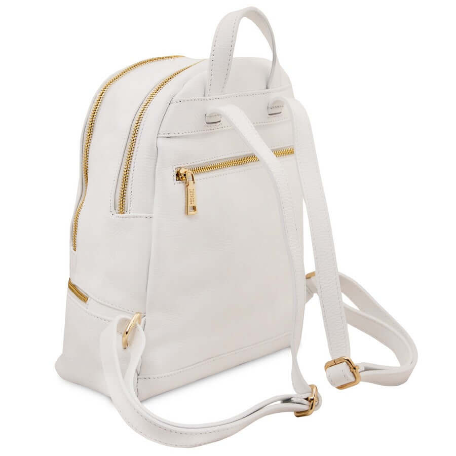 This luxurious Ladies Small Leather Backpack is crafted with soft, hammered leather and elegantly detailed with golden hardware that adds a touch of sophistication. It has a roomy compartment and various pockets to keep your items organized, plus a pocket with closure on the rear side for extra security. The interior features a zip pocket and an open pocket.